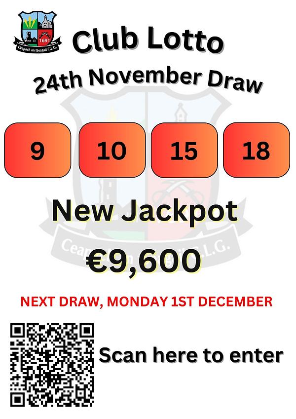 Next weeks jackpot is €9,560. Purchase now on the app or from any club officer. Monies raised from the lotto go back into the club, developing our facilites, pitches and players.