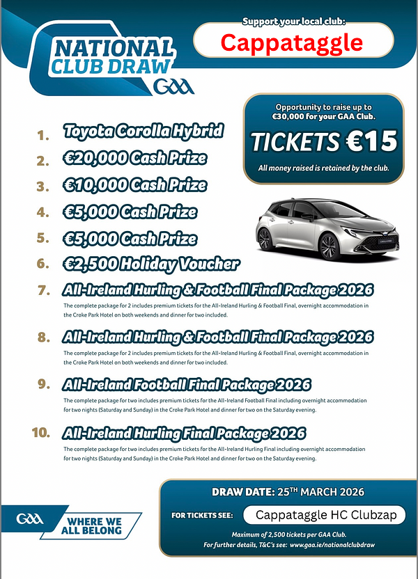 We’re excited to launch this exciting GAA draw with fantastic prizes. 100% of club sales go back into the club.